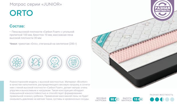 Разносторонняя модель с высокой жесткостью. Материал «Bicotton» в качестве наполнителя, распределяющего весовую нагрузку, в сочетании с пеной высокой плотности «Carbon Foam», делает матрас очень упругим и выносливым к нагрузкам. Такая конструкция обладает повышенной износостойкостью и способствует формированию правильной осанки у ребенка. Применение массажной пены не будет оказывать давление на мягкие ткани, суставы и кровеносные сосуды.