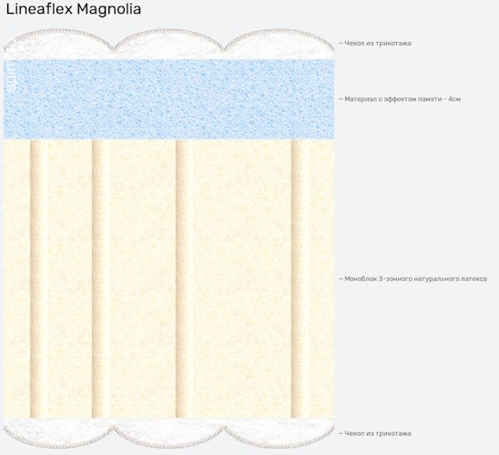 Высота матраса Магнолия 19 см. Комплектуется антибактериальным съемным чехлом на молнии из натурального трикотажа. Стежка – холлофайбер с терморегулирующей способностью. Максимальный вес во время эксплуатации 140 кг.