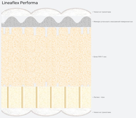 Высота матраса Перформа 26 см. Уровень жесткости «два в одном». С одной стороны – жесткий, с другой – мягкий. Рекомендуемая нагрузка – 140 кг на одно спального место. Чехол выполнен из долговечного итальянского трикотажа перламутрового цвета. Стежка – гигроскопичный файбер (300 грамм).