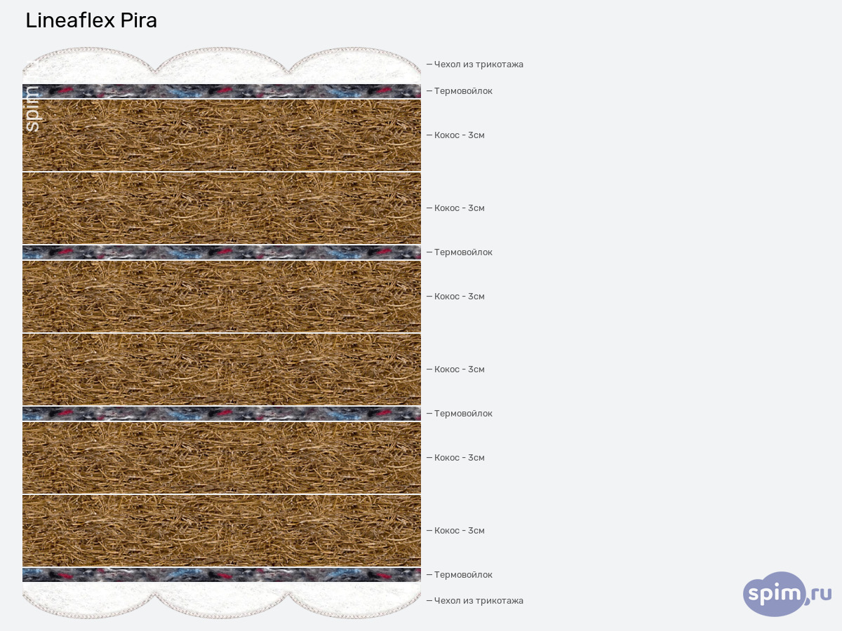 Высота матраса Pira составляет 21 см. Чехол выполнен из мягкого и приятного на ощупь высококачественного жаккарда (в составе 40% хлопка). Имеет белый цвет с перламутровым оттенком. Стежка – гипоаллергенный и экологически чистый файбер. Гарантия изделия – 25 лет условно. На самом деле, эта модель способна порадовать своим комфортом, куда более долгое время.